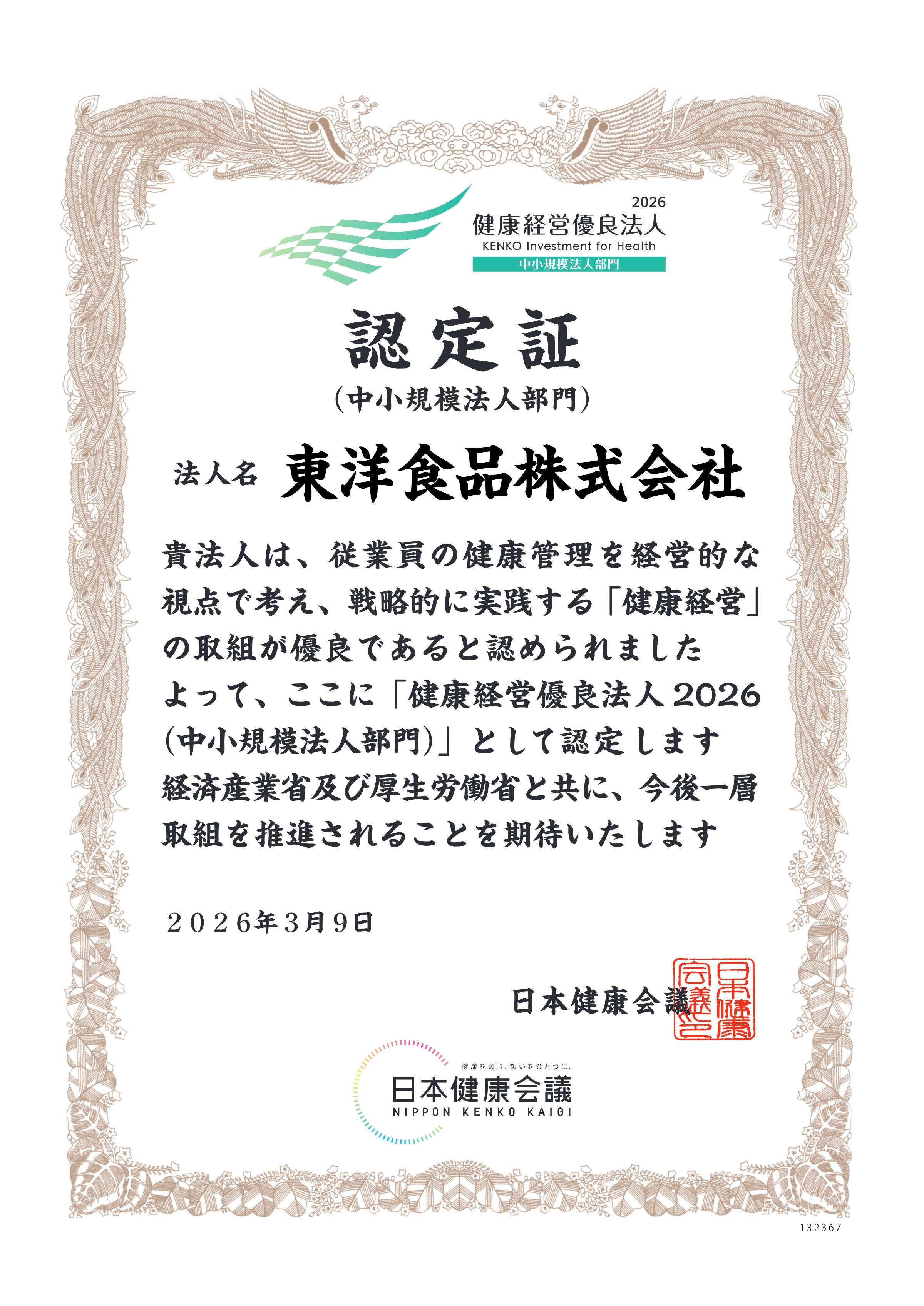 東洋食品株式会社は、経済産業省が認定する健康経営優良法人認定制度において、2026年3月9日(月)、「健康経営優良法人2026(中小規模法人部門)」に認定されました。