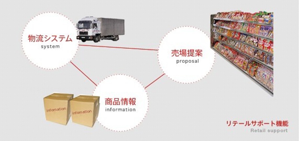 工場、病院、学校、官公庁等の職域売店専門に、豊富な取り扱い商品の中からきめ細かに品揃えし、売場に最適な小口納品で商品を提供致します。配送はすべて当社社員が直接行っておりますので、新商品情報、各種有益な情報、売り場提案などお気軽にご相談いただけます。